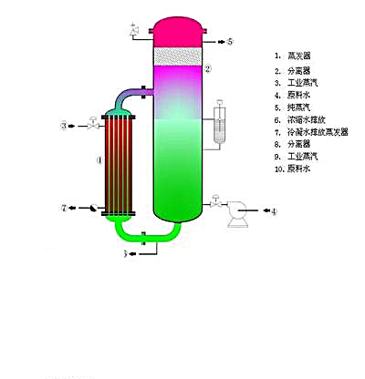 合格的原料水由多級泵增壓后經(jīng)流量計進入預(yù)熱器,經(jīng)熱交換后溫度可比蒸發(fā)器加熱蒸汽低10-15℃, 然后進入在蒸發(fā)器經(jīng)料水分配器噴射在加熱管內(nèi)壁,使料水在管內(nèi)成膜狀流動,被鍋爐蒸汽汽化,產(chǎn)生的夾帶水滴的二次蒸汽,從加熱管下端進入三級分離裝置,被分離后生成純蒸汽。可以在線檢測純蒸汽冷凝水的電導(dǎo)率,從而檢驗純蒸汽是否合格。鍋爐蒸汽的蒸發(fā)器被原料水吸收熱量冷凝后,凝結(jié)成鍋爐蒸汽凝結(jié)水,作為預(yù)熱