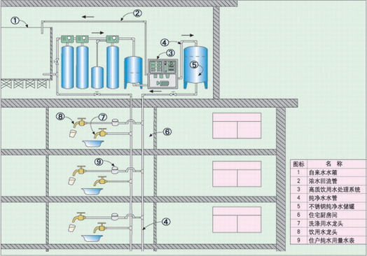 分質(zhì)供水是指根據(jù)生活中人們對水的不同需要,由市政提供的自來水為生活飲用水,采用特殊工藝將自來水進行深度加工處理成可直接飲用的純凈水,然后由食品衛(wèi)生級的管道輸送到戶,并單獨計量。這種直接飲用的純凈水分純水或凈水,即按照中華人民共和國GB 17323《瓶裝飲用純凈水》,以符合生活飲用水衛(wèi)生標準的水為原料,通過反滲透膜(Revvrse Osmosis Element/RO)凈化處理后,稱為純水。按照建設(shè)部CJ 94《飲用凈水水質(zhì)標準》[3],用同樣符合生活用水衛(wèi)生標準的水為原料,通過納濾膜(Nanofiltration Element/NF)或法國卡提斯(CARTIS)載銀活性炭凈化處理后,稱為凈水。
